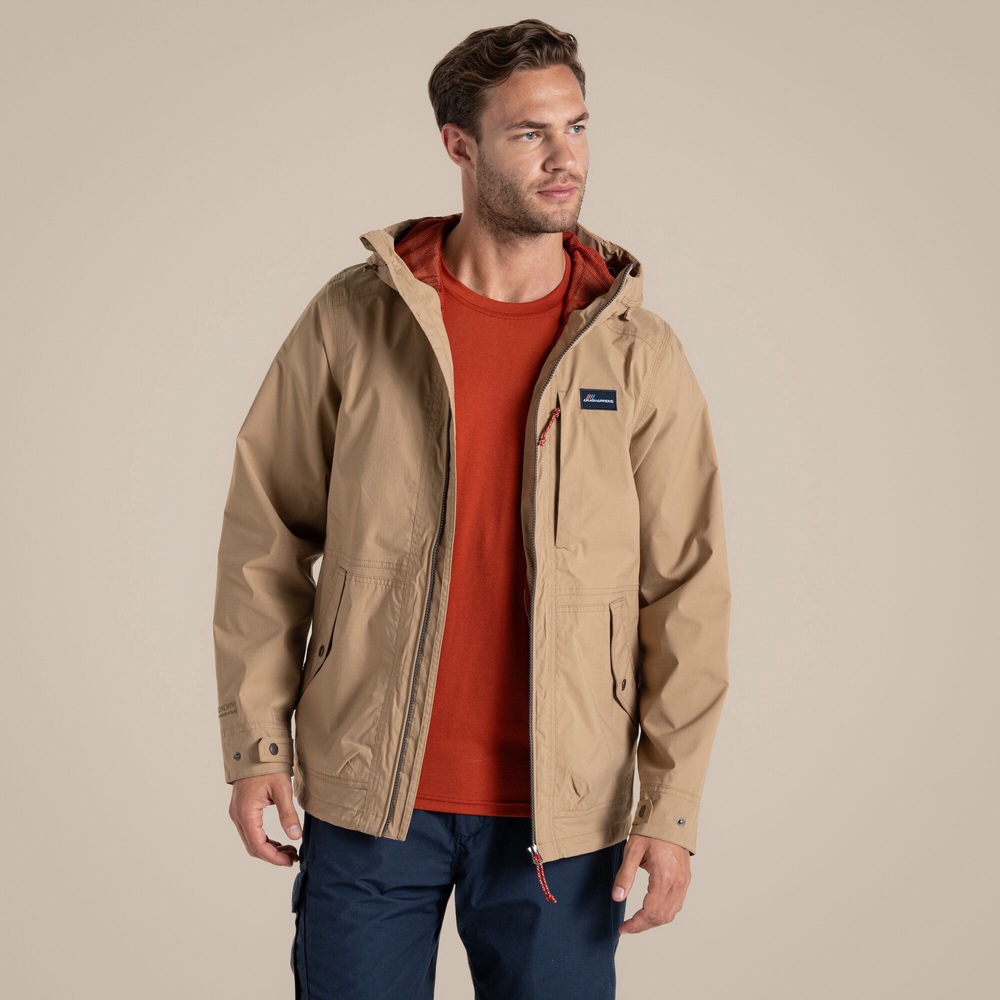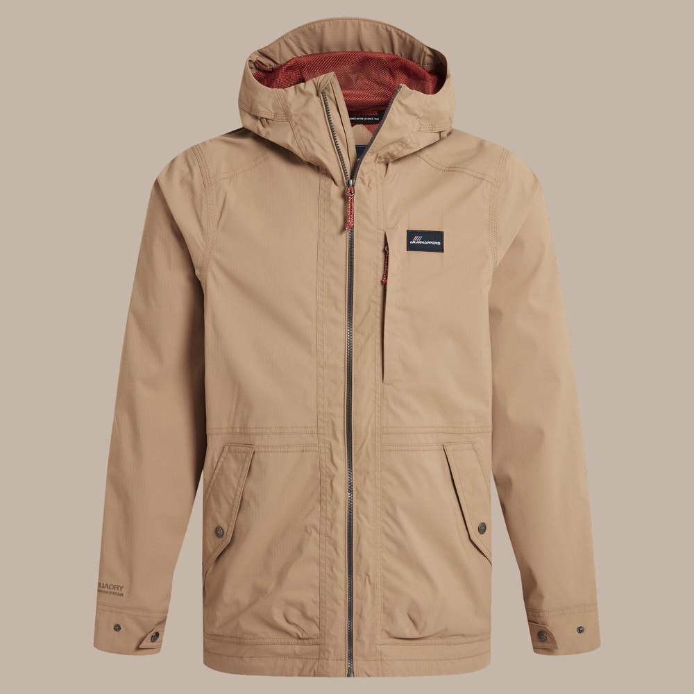 Contemporary shell jacket made from tough AquaDry Membrane stretch ripstop with H2OShield finish for agile protection against wind and rain. The relaxed fit incorporates an adjustable grown-on hood, waterproof centre-front zip and contrast trim and lining, making it the smart choice for outdoor pursuits.
